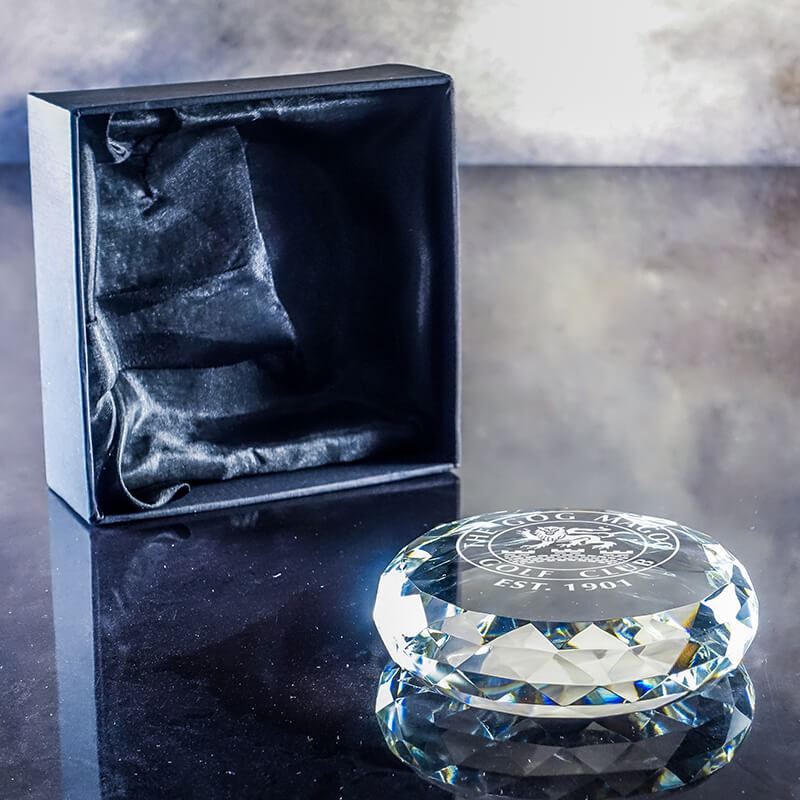 Lovely flat paperweight with faceted edges, and is 100mm diameter.